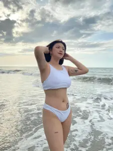 ก็จะมีเรื่องราวส่วนตัวที่น้องลงไว้ให้ติดตามกัน จุดเด่นคงเป็นหุ่นที่มาแบบเนื้อ นม ไข่ แน่นมาก โดยเฉพาะหน้าอก คัพอี ของแทร่ของจริง ของธรรมชาติ แล้วใส่อะไรมันก็สวยอ่ะลุคนี้มา เจอชุดนี้ก่อนเลย ชุดว่ายน้ำ ทูพีชสีขาวดำลายม้าลายที่น้องใส่ให้เห็นเพียงแค่บราเท่านั้น ข้างล่างน้องใส่กางเกงทับไว้ เลยอดเห็นแต่จะบอกว่า